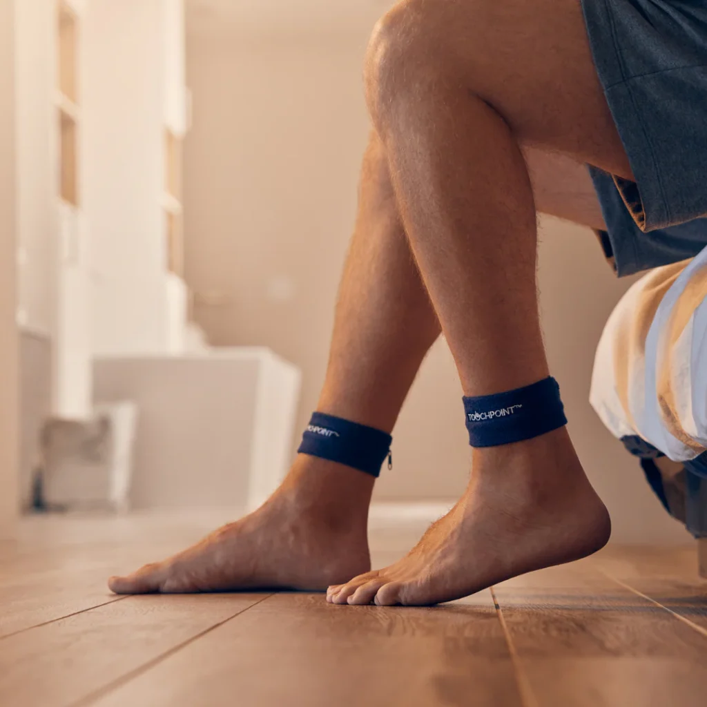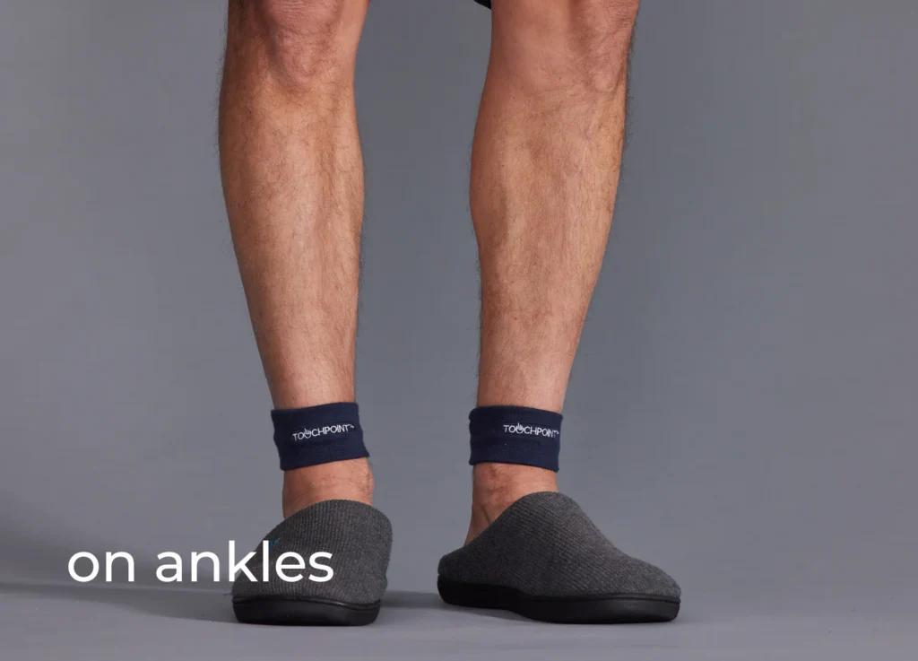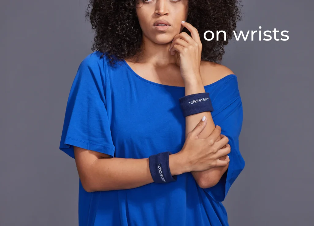 4. Place one TouchPoint on each side of the body and feel the calming vibrations. Note: the average user wears TouchPoints for 20 minutes in the morning or evening, or as needed throughout the day.